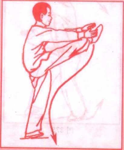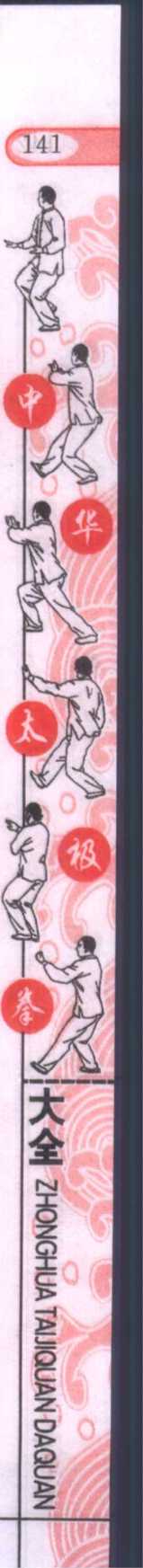 0图377图378图379图380太银拳diibasmi YAiJkfaUAKi w-p*1(2)重心后移,身体继续向右转,左脚尖里扣,重心再移回左 腿,然后右腿提起,右脚由左向右上方摆出(腿自然伸直);与此 同时,顺手顺左臂外侧上举,两手经头上方先向右然后向左侧 摆过,双手拍击右脚面(左先右后);眼看两手。(图378?380)