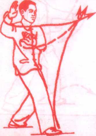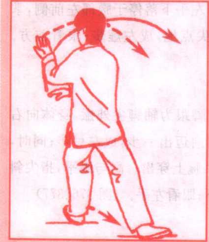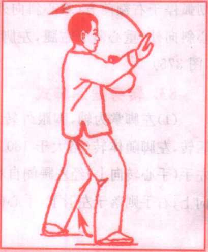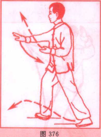 (1)左脚掌为轴,脚跟外转,右脚跟为轴脚尖外撇,身体向右 后转,左脚随体转(略大于180°)向前迈出一步,成左弓步;同时, 左手(手心转向上)经左腰侧自右手腕上穿出。高与眼平,指尖斜 向上;右手则落于左肘下,手心向下;眼看左手。(图376、377)