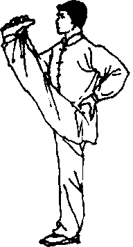 做 法:一腿微屈支撑,另一腿同侧手扳住体前蹬出。