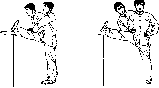 做 法:同侧压腿,唯将脚置于高于肩的物体上。(图