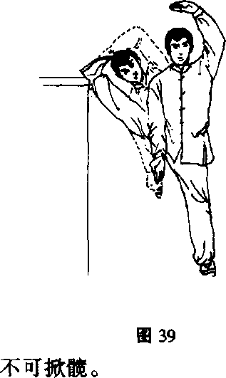 做 法:与卧靴动作相同,唯将脚置于同腰高的物体 上。(图38)