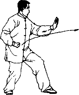 齐。动势:右掌经心窝向上弧形搬出,握拳不宜过紧,拳背 与小臂平齐,始终保持沉肘状态。右脚也要外旋弧形上步, 不可直进直退。