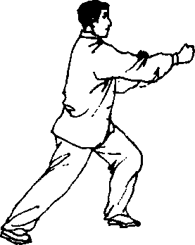 【教学要点】 教学中强调丛上势到本势有中间马步过 渡的蓄劲过程,并明确发力的点程,可用手从脚踝处沿劲力 传递路线轻抚,以增加本体认识。