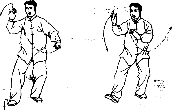左脚前跟半步,身体重心移于左腿,然后右脚提起落 下,脚跟着地,膝部微屈,成右虚步;同时,右掌略向右侧 方斜带,再向前方下落成侧立掌,高与眉齐;左手上起举于 右肘内侧,高与胸齐,两手手心相对;眼看右手。(图85、 86)图85 图86,L