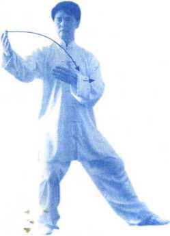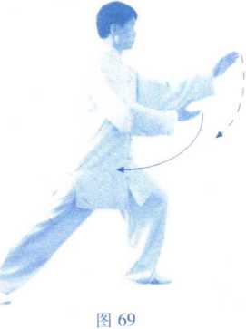 左腿 屈膝,上体慢慢后坐,身 体重心移至左腿,右脚 尖翘起;然后身体左转, 右脚尖内扣,身体重心 再移至右腿,左脚随匕 体左转收至右脚内侧, 脚尖点地;同时右手向 左屈臂平举于胸前;左 手向左划弧至左侧,再 向右上划弧至右肋前, 使两掌手心上下相对成 抱球状。(图64、65、66)
