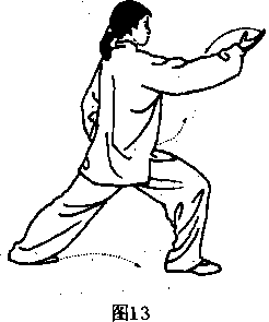 身法:上体渐右转;胸向东稍偏北,右脚上步后重心渐前移。