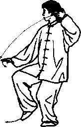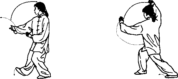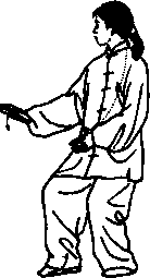 身法:重心前移,上体先微微右转,再渐左 转,胸向西微偏北。