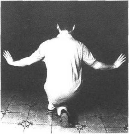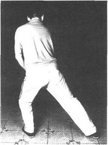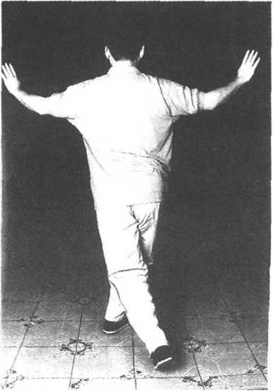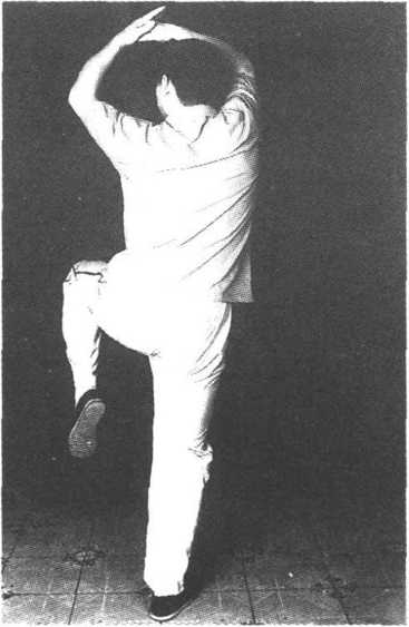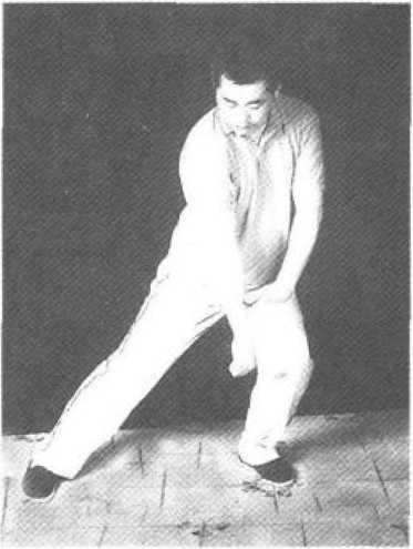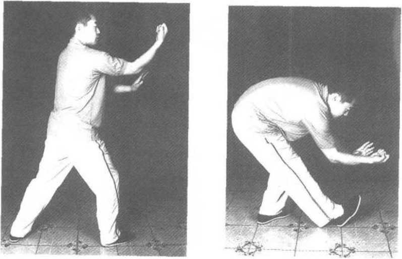接上式,右掌变拳,轻击左掌心,同时左膝提起 (图67)。松右腿,左脚点地,双手顺着身体中轴,图66由上而下至丹田时,指地下击,同时全身坠地,重心 左七右三(图68、图68附)。图6858. 磨盘肘接上式,以腰为轴带动右肩、肘、手右转90。。 左手前推,右拳从面部向前盖出,同时重心前移至右 腿(图69)。上动不停,上身右转45。,左掌贴于右拳 腕处,共收于右胯处,同时重心后移至左腿。上臂不 动,以腰为轴带动双手,从右至左并随身上前平划一 圆圈后归回原处。59. 指裆捶接上式,吸胯,弯腰,双手向前下方击出(图 70) o