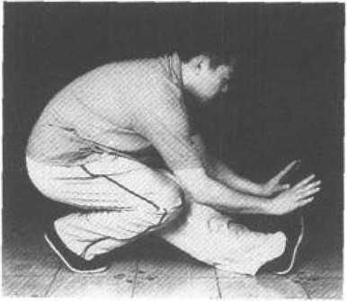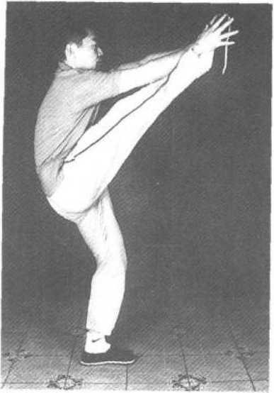 接上式,双手变俯掌上棚,双臂撑圆。左腿提膝 前收,向前下方横踹后落地(图71)。右腿前踢,双 手拍击脚面(图72)。
