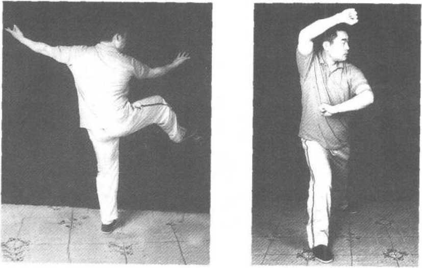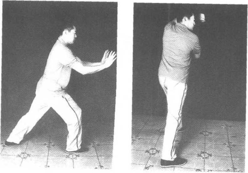 接上式,上动不停,右腿与右臂相合右摆135。 后,松左腿,右腿以脚跟落地。右掌划弧至右耳际变 拳向左打出,左掌变拳向右腋下打出,同时重心移至 右腿,左腿回蹬,呈小弓步(图76)。
