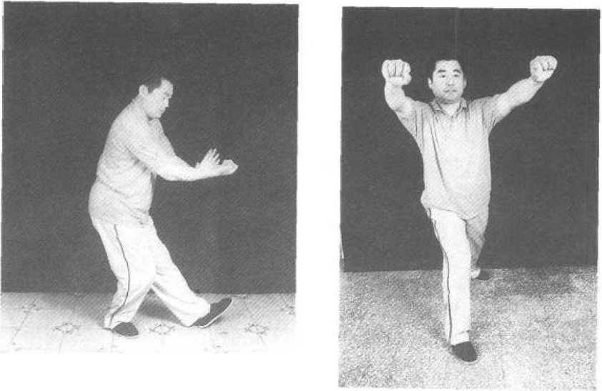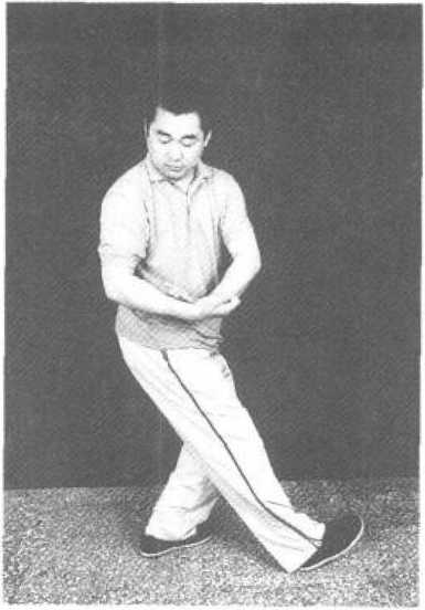 接上式,左脚回收到右踝处再向身体左方迈出, 脚跟着地,与右脚呈不丁不八式,双拳向外拧翻同时 向胸前掩肘,当右拳与心窝相平时,向前拧钻,同时 左腿弓膝,呈小弓步(图77)。