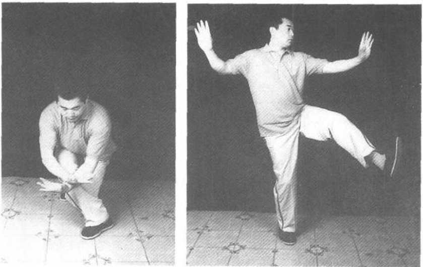 接上式,松肩、松腰、松胯、松膝、松足,全身 下落呈盘根式,同时双拳变掌向下划弧收于右足前, 如水中捞物一般(图81)o