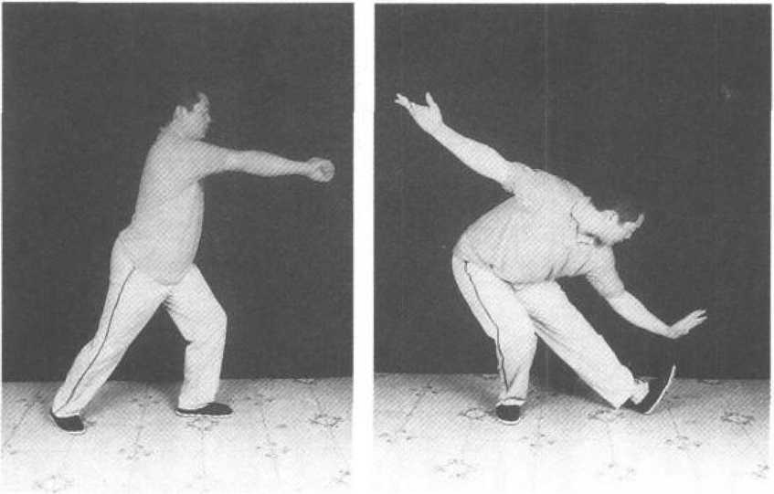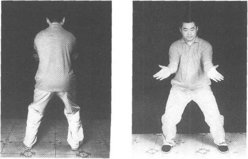 接上式,上身右摆135。后,左足落地,蹲马步, 双掌划弧收于腰侧,并向前抱掌击出(图83、图83 附)。