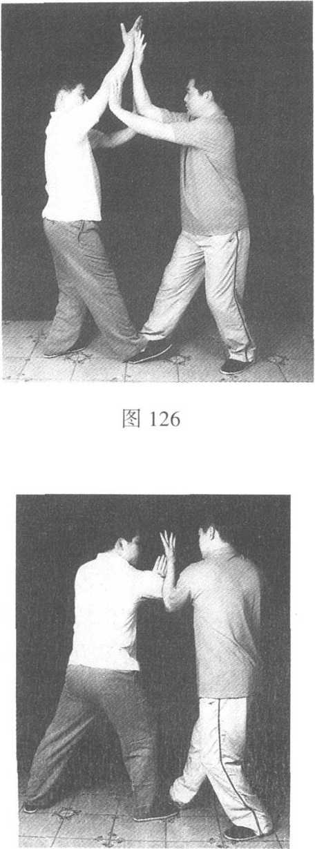 乙的前臂,按向乙的腹部(图129)。乙顺着甲的按劲
