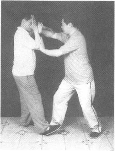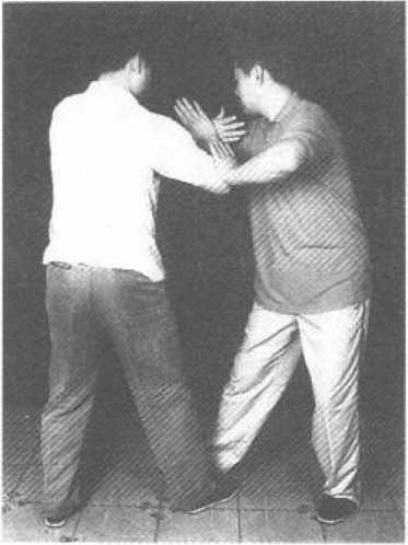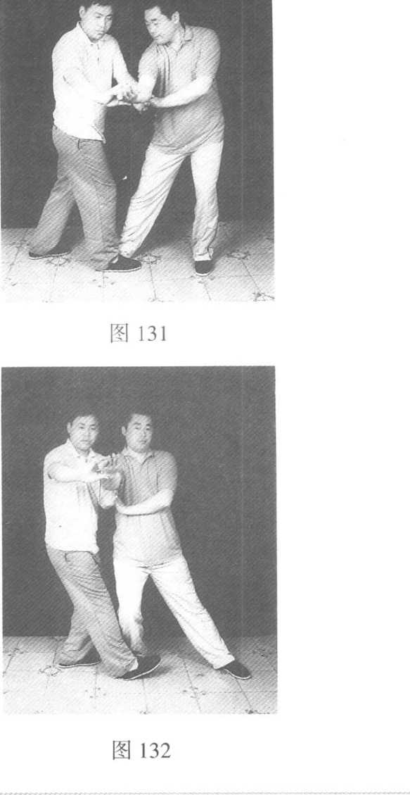 靠必拗:甲靠乙,乙退步含胸,以倒化之(图133)。 拗必中定:甲靠乙,乙以例化之,甲借捌之势以