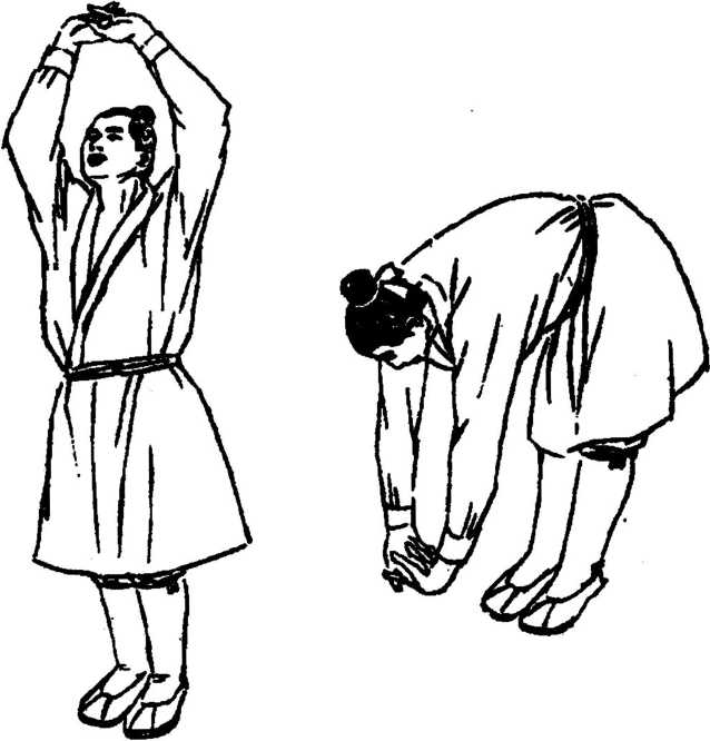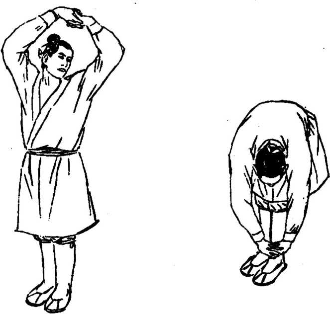!前俯腰须双并步,身体直立抬起臂。 i两手一叉头上举,再把腰际前下移。