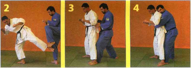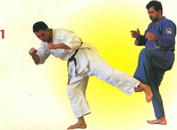 1. A用左腿胫骨踢击(低踢)D的大腿内侧。D将左腿向上抬起并向内收,越过
