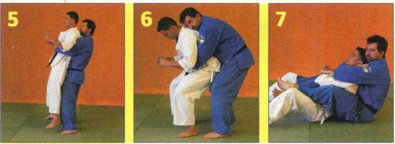 7. D把A也拽倒在地,自己也随之倒地,使A的背部靠在自己身上。D用左手