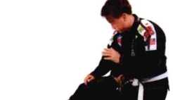 3甲方双手抱紧乙方在前的右腿,右手置于对方 右腿膝盖后方,左手置于对方右脚跟处,将头: 他的腰带打结处。