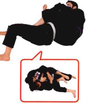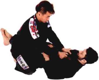 7甲方双脚内勾,放在对手大腿内侧,但不要交叉。 右手自下而上绕过对方颈脖,左手穿过对方腋下, 紧紧抓住右手手腕。耳朵紧贴对方耳朵,用力下压。