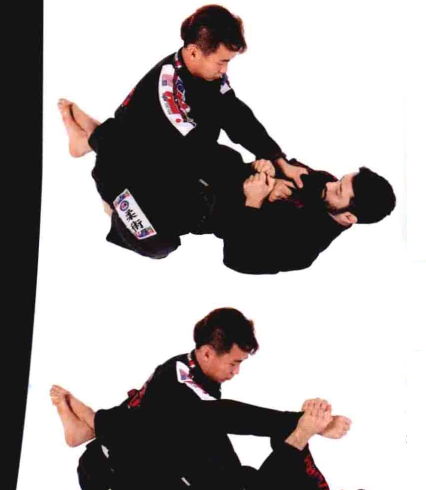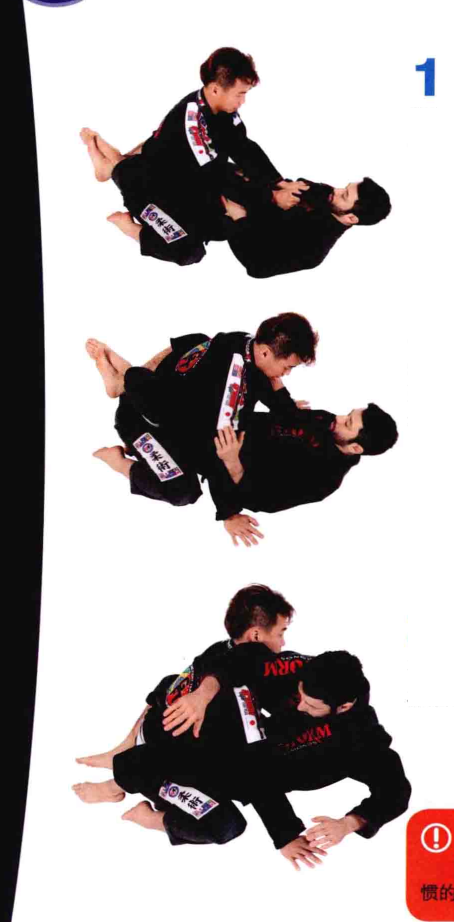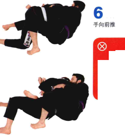 做到这个位置的时候,很多人会想直接翻 到对手背上去,这个可以做到,但是很费劲。比 较省力旦保险的做法是,一只手推,另一只手拉, 将其翻转过来。这样比较不容易失去对对手的控 制。