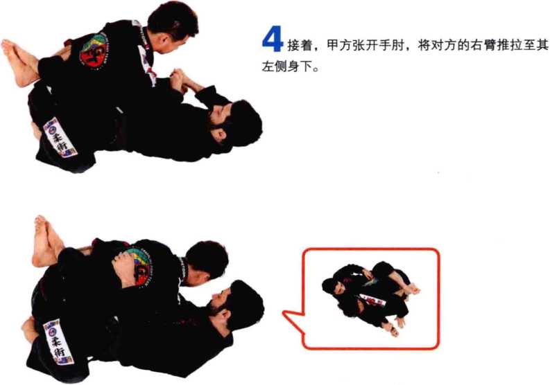 3甲方打开自己的防守位置,双脚落地,同时上 半身侧向左边,右手绕过对方右肩,左手肘撑地, 将身体的重量都落在左手臂上。