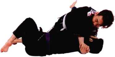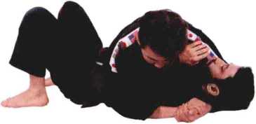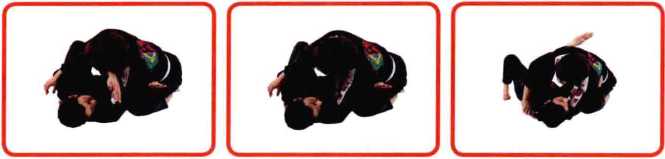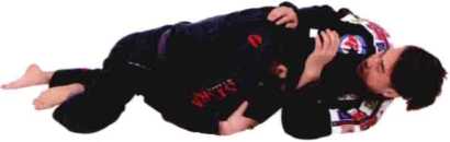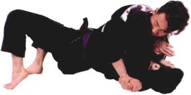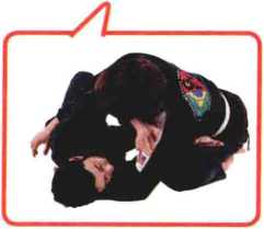 多人在做这个动作时,试图将对手向上 推,这是无用的。你与对手之间没有空隙,你的 左手无法穿过对方的身体,就没有办继续下面的 动作。必须通过向斜上方起桥来获得空隙。