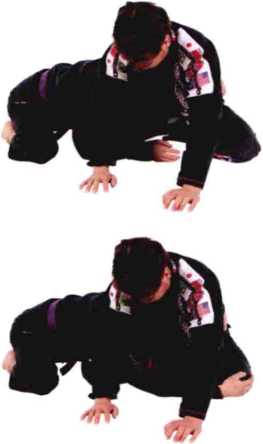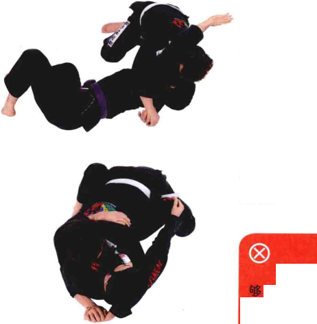 做这个动作时,有人试图移到对手 后面去,这是错误的做法。当翻身跪地时, 自己的身体必须和对方成90度角,只有 这个角度才是推倒对方的最佳位置。