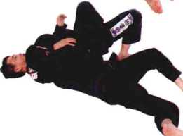 躺在垫子上,右臂一定要收回,右手肘必须接触 地面,不要让对方将你的右臂拉直。这两点非常 重要,否则想要做出反击非常困难。最佳状态是, 你的右手肘能缩到双方身体之间,紧贴对方胯部。