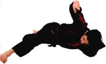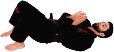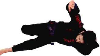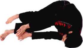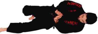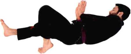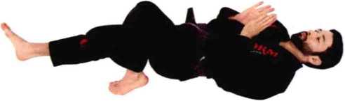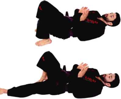 2身体侧向左面,左手屈肘抱住头部左侧,右手 臂上抬呈反锁之势。同时,左腿伸直,右脚前掌撑地。