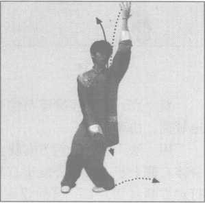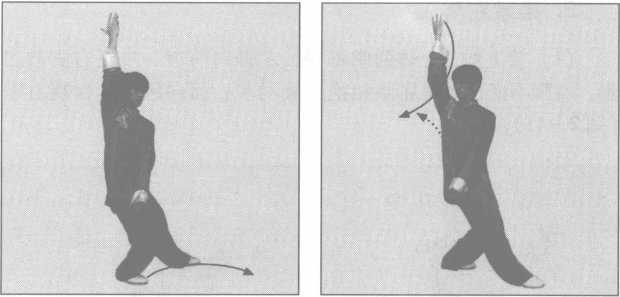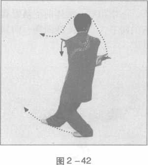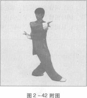 (2) 上体右转,右脚向右前方外摆上半步,脚尖顺直左脚 不变,同时,右臂内旋圆撑置于右前方,指尖斜向上,掌心向 前,高与眉齐;左掌小臂外旋,掌心向上,经右臂下向体右侧穿 出,置于右腋下外侧;目视左掌(图2-42、42附图)。