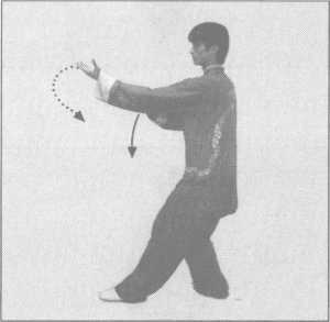 接上势,上体两脚不变;右掌小臂微屈内旋下落,指尖向 上,掌心向里,高与眉齐;左臂亦内旋,屈肘置于右肘内侧下 方,指尖向上,掌心斜向外;目视右掌,沿圈走转一周至右脚在 前时换下势(图2-40)。