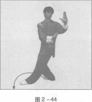 (4) 上体左转,同时,两臂随上体左转内旋,左掌在前, 五指向上,掌心向外推,高与眉齐,右掌屈肘置于左肘内侧下 方,五指向上,掌心向外;目视左掌,沿圈走转一周至左脚在前 时换下势(图2-44)。