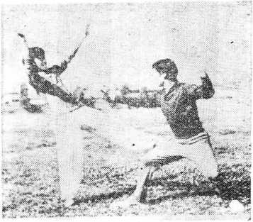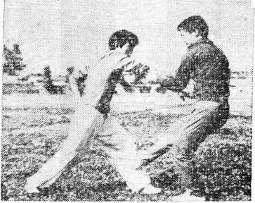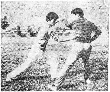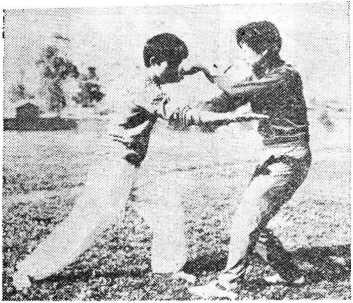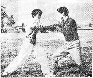 乙以右手缠刁甲方右腕,左手同时扣拿对方的右肘关 节,往右侧下握,抬起右腿蹬踹甲的左膝关节(图133)。