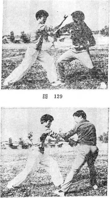 甲胸部略向后含缩,以左手向下搬乙的右挫掌,同时右 手迅速收回握拳,反背甩击乙头脸部(图129) o