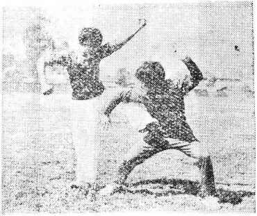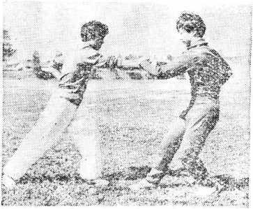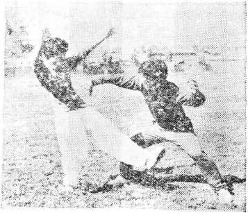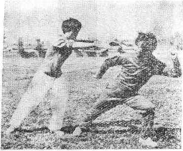 乙右脚向前上一步.脚尖内扣,落于甲的左腿后;左手 从右肘下向外上穿,并且迅速以右掌反手向斜上方撩乙的裆 部(图151)。