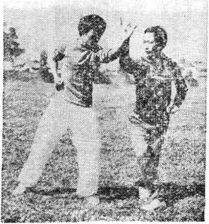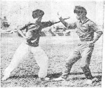 用紧接着以左拳击乙面部。乙向上举起右手,用右小臂 外侧挂开甲的左冲拳(图153)。