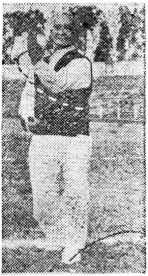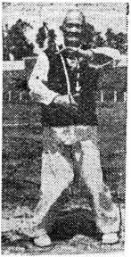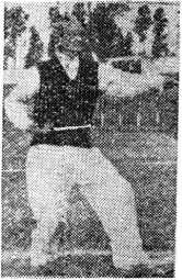 左脚向左沿圆摆跨一步,脚尖微向外展,重心偏于右 腿,左掌内翻,手心向下,从胸前向左划弧(图16)。