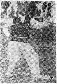 左脚向左摆跨一步,脚尖微向外展,重心偏于右脚;左 掌内翻,手心向下,从胸前向左划弧(图20)。