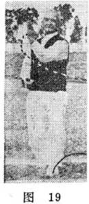 随体转动,置于右肩,两臂上下裹抱,两脚尖相对,眼看左 后方(图17)。