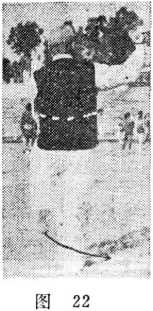 要点:①图21是背面正视图,之所以这样拍摄,目的在 于方便读者观察。②提膝与上冲拳要协调一致,提膝是为了 用膝部顶撞对方胯裆。
