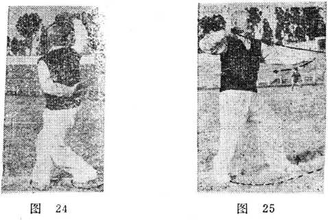 身体左转,右脚尖内扣,左脚跟着地,脚尖外摆,左掌 向后伸,手掌外翻,手心向上,两眼注视左手(图25)。