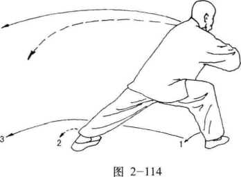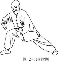 动作说明:接上式。右脚向后撤一步,重心右移, 身体下沉,身体右转成弓箭步;同时,右 拳变掌顺时针转圈刁拿,然后变拳外旋置 于右肋前,左掌亦边外旋边向下、向左、 向上、向左划圆,用左前臂向下反压,左臂伸于左前方(左拳心向上), 两手配合使用,做刁拿压肘技法,眼睛注视左拳。(图2-114、图2-114 附图)要点:①两手挽圈,刁拿和压肘要同时完成,配合协调。②压肘要和右弓步协调,要用劲整。③左压肘时左臂不可伸直。④弓步时,臀部要收,不能往前低头。
