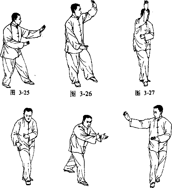 站好左七星势,左掌下翻(图3—25),由上向左上方 往下划一大轮,同时进腿向左斜方横上步(图2—26)。然 后握拳停于肋下,同时右掌由下相应由右上方划一大轮过 头。掌指向上,同时右腿向左随上一步,右腿虚步停于左脚 前(图3—27)。随右臂用力下划到身之右侧时(图3—28), 右腿向右侧前方迈一大步,这时掌根相对,双掌并齐向前随 步撞出,为左立掌(图3—29)。右立掌与左势同,唯方向 反。