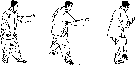 以我之前手,抓住敌之手腕,以后手握拳,推击其腰, 复击其肋,变掌乘虚攻其腰腹部。故此拳诀曰:“二仙传道 法如神,外领上步打后心。”