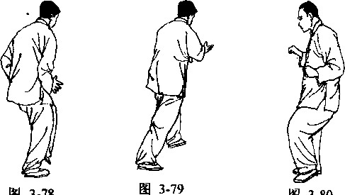 回身,扣左步右转身(图3—80),右掌变拳上左步外 领,左拳拧臂姬击,随即提右膝虚右步,右拳横击虻打,然 后左足后撤,右足随之虚于左足前,双拳变掌,随上步向前 撞击。左膝前提上步,左臂向肋截打(参考图3—76至3一 79,左右相反)。回到左势二仙传道,循环往复,多少自便。