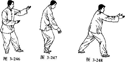 回身,扣前左脚向右转身后,右拳打一截肋,随上翻划 一小弧握拳拉回,左掌向右掌前下插左步上虚(图3— 253),双掌根相对上左步向前撞击,上右步,双掌上翻,掌 心相对用力向上而击,成双风贯耳,然后双掌向右划一大弧 握拳,同时撤左步,左拳不动,右拳向前打一截肋。回到左 撞掌。循环往复。