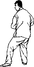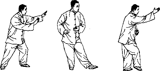 握拳,扣右步身转一圈后,左腿向左前方跨一大步,左拳随 势向前横打一截肋。回到左扣掌。循环往复,多寡自便。