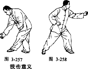 回身,扣前脚,双拳随左转身,向左上方划一大圈握 拳,拉至右肋前(图3—259),左拳不动,右拳变掌,掌心 向前直击,转腕向下用力扣掌。随反向左转身,右掌随转身