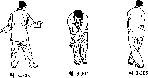 站好左七星势,撤左步左掌同时反臂外挑,向左拧身左 脚撤至右腿后,右掌随身拧左转上起握拳。左掌向身后甩 出,右拳横在腰间不动.(图3—303),左腿随身右转,左掌 用力横击,扣到膝下(图3—304),然后向前立腿扣脚跨进 一大步。身随右转一周,左掌收回护住右肘(图3—305), 右拳随右转身向前横打一截肋。同时右足向前横跨一步,此 即为左闪掌(图3—306)。